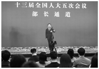 ▲ 3月8日,十三屆全國(guó)人大五次會(huì)議舉行第二場(chǎng)“部長(zhǎng)通道”采訪活動(dòng)。圖為本報(bào)記者通過(guò)網(wǎng)絡(luò)視頻方式向水利部部長(zhǎng)李國(guó)英提問(wèn)。