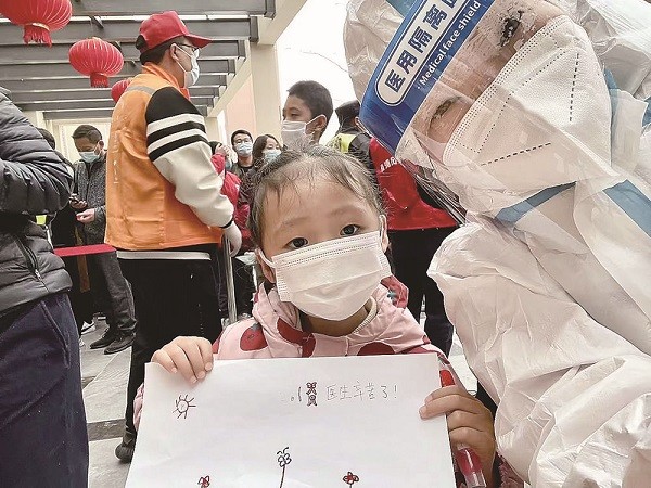 張智華委員所在的上海易瑞生物科技有限公司全員拉上了核酸檢測的“火線”。張委員告訴了我們這樣一個故事:“這幾天,我們蹲點周浦傅雷圖書館和社區(qū)為市民提供免費檢測服務(wù)。昨天(19日)有位EVA小朋友在做完核酸檢測后,獻(xiàn)上自己畫作給我們的‘大白’,還特別寫上了‘醫(yī)生辛苦了’,大家都說一身的疲憊感瞬間消失殆盡!”