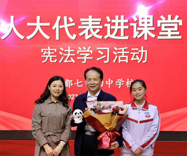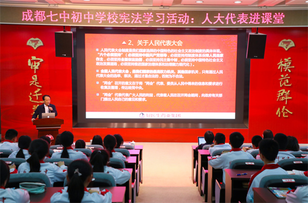 初中是學(xué)生在校學(xué)習(xí)的重要階段。部編版八年級下冊《道德與法治》教材是憲法教育專冊,其中第三單元《人民當(dāng)家作主》中重點(diǎn)介紹和講解了我國的根本政治制度——人民代表大會制度,還詳細(xì)介紹了我國的一項(xiàng)基本政治制度——中國共產(chǎn)黨領(lǐng)導(dǎo)的多黨合作和政治協(xié)商制度。這些制度是中國特色社會主義民主的實(shí)現(xiàn)路徑。學(xué)習(xí)相關(guān)知識理解國家制度,不僅需要通過道德與法治老師課堂教學(xué)理論,還需要通過增進(jìn)與民主政治現(xiàn)實(shí)生活對話。人大代表和政協(xié)委員們是我國民主政治生活的親歷者、見證者,走進(jìn)校園和學(xué)生進(jìn)行近距離交流,能夠幫助學(xué)生生動直觀地了解我國民主政治生活的生動實(shí)踐,有助于學(xué)生更好地了解并理解人民代表大會制度和政治協(xié)商制度。為此,成都七中初中學(xué)校舉辦憲法專題教學(xué)“代表委員進(jìn)校園”活動,邀請十二屆、十三屆全國人大代表耿福能和十六屆成都市人大代表、七中初中學(xué)校校長李笑非為大家傳達(dá)、分享和交流。
