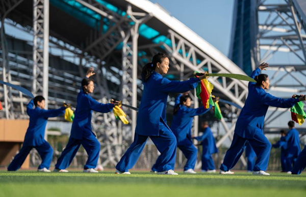 5月27日,市民在河北省黃驊市天健湖共享體育場練習太極刀。新華社記者?駱學峰?攝