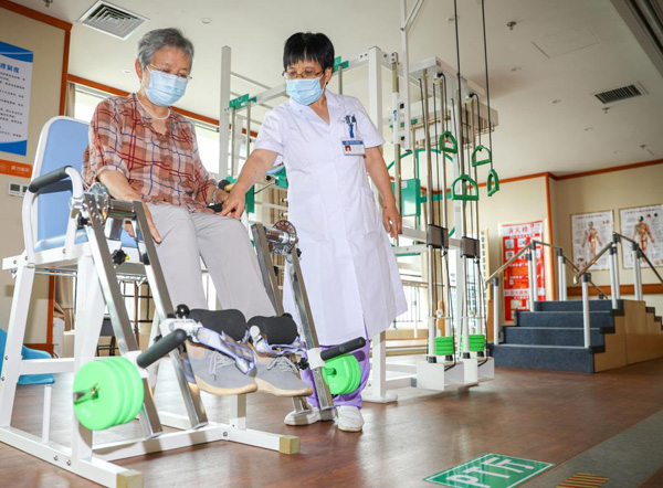 6月20日,在日照頤養(yǎng)公寓,醫(yī)生指導老人通過訓練椅進行鍛煉。新華社記者?范長國?攝