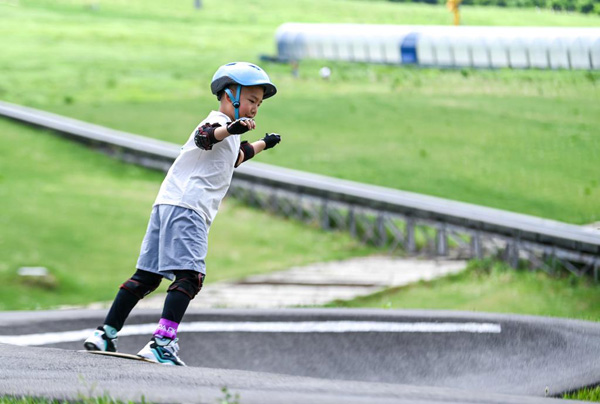 5月28日,一位小朋友在吉林市萬科松花湖度假區(qū)練習滑板。新華社記者?顏麟蘊?攝