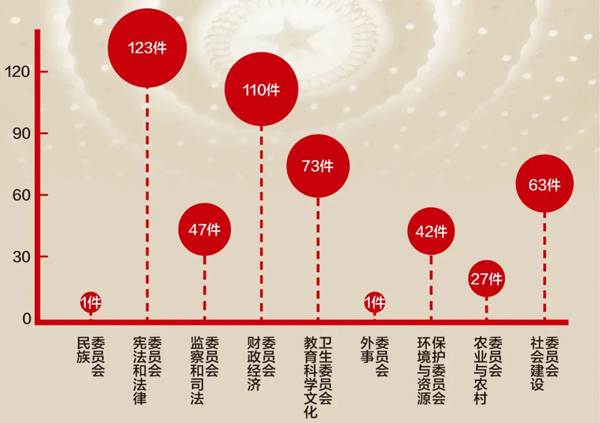 根據(jù)十三屆全國人大五次會議主席團(tuán)通過的代表提出議案處理意見的報告,十三屆全國人大五次會議收到的487件代表議案,分別交由全國人大9個專門委員會審議。其中,交由民族委員會審議1件,憲法和法律委員會審議123件,監(jiān)察和司法委員會審議47件,財政經(jīng)濟(jì)委員會審議110件,教育科學(xué)文化衛(wèi)生委員會審議73件,外事委員會審議1件,環(huán)境與資源保護(hù)委員會審議42件,農(nóng)業(yè)與農(nóng)村委員會審議27件,社會建設(shè)委員會審議63件。
