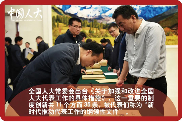 十三屆全國(guó)人大及其常委會(huì)履職以來,總結(jié)和把握代表工作規(guī)律,在支持和保障代表依法履職、充分發(fā)揮代表作用方面探索創(chuàng)新,做了大量工作,進(jìn)一步完善制度機(jī)制。栗戰(zhàn)書委員長(zhǎng)對(duì)代表議案建議工作高度重視,提出“內(nèi)容高質(zhì)量、辦理高質(zhì)量”和“既要重結(jié)果、也要重過程”的代表議案建議工作要求。2018年,委員長(zhǎng)會(huì)議修改《全國(guó)人民代表大會(huì)代表建議、批評(píng)和意見處理辦法》。2019年,全國(guó)人大常委會(huì)出臺(tái)《關(guān)于加強(qiáng)和改進(jìn)全國(guó)人大代表工作的具體措施》,這一重要的制度創(chuàng)新共11個(gè)方面35條,對(duì)做好代表工作提出全面、具體的要求,被代表們稱為“新時(shí)代推動(dòng)代表工作的綱領(lǐng)性文件”。
