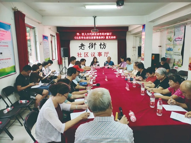 2019年8月28日,市、區(qū)人大代表在石景山區(qū)蘋果園街道蘋四社區(qū),聽取市民對《北京市生活垃圾管理條例(草案)》的意見建議。(北京市人大常委會供圖)