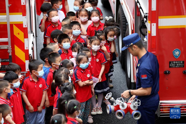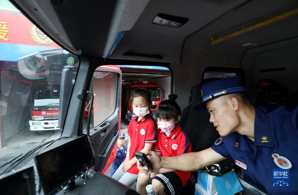 5月30日,在湖南省資興市消防救援大隊,小朋友們在消防員的帶領下參觀消防車。