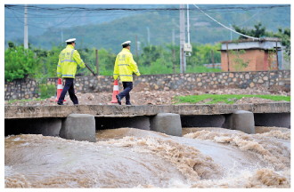 圖為天津市公安局薊州分局民警在有安全隱患的漫水橋處設(shè)置提醒標(biāo)識(shí)。 本報(bào)通訊員 呂志會(huì) 攝