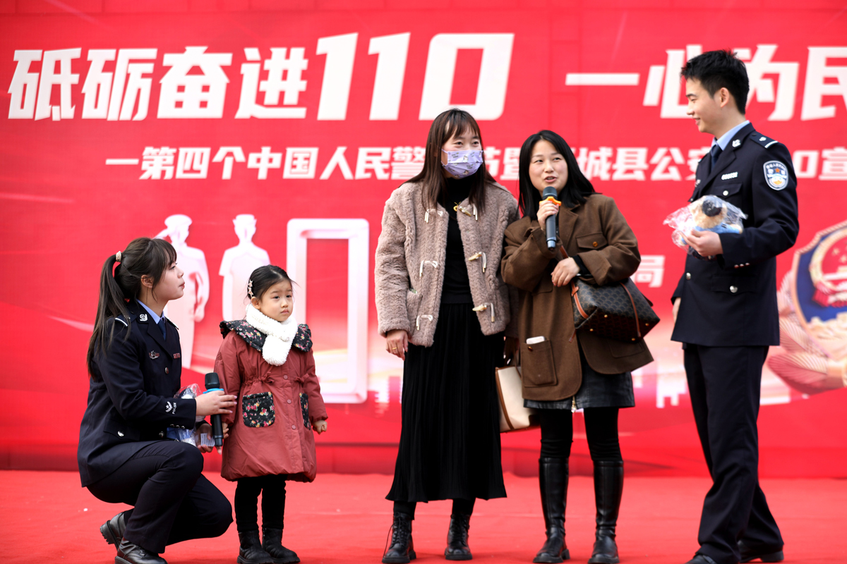 1月9日,安徽省舒城縣公安局在轄區(qū)市民廣場舉辦“砥礪奮進(jìn)110,一心為民保平安”匯演活動。民警通過警用裝備展示、反電詐情景劇表演、問答互動等形式,慶祝第四個中國人民警察節(jié)暨全國第38個“110宣傳日”。圖為民警與市民互動答題。