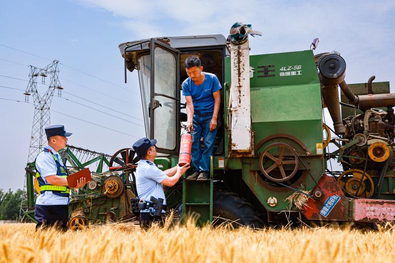 近日,山東省聊城市冠縣公安局店子派出所組織民輔警深入田間地頭,開展防火、防盜、防詐騙等安全防范知識宣傳。圖為民警檢查隨車滅火器配備情況。