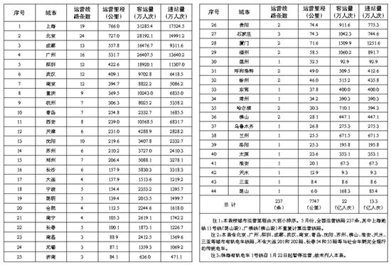 5月,全國(不含港澳臺,下同)共有45個城市開通運(yùn)營城市軌道交通線路237條,運(yùn)營里程7747公里,實(shí)際開行列車263萬列次,完成客運(yùn)量22億人次,進(jìn)站量13.3億人次,未發(fā)生較大以上運(yùn)營安全責(zé)任事故。