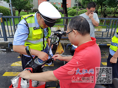 “同志,請把這張?zhí)嵝褬?biāo)簽貼在你電動自行車的前面,時刻提醒你戴上頭盔。”7月5日,南昌市紅谷灘區(qū)鳳凰南大道上,紅谷灘交警大隊二中隊民警李黎正在勸導(dǎo)騎電動自行車的市民佩戴頭盔。除了對未佩戴頭盔的車主進行警示教育外,他還在每輛電動自行車顯眼位置貼上提醒標(biāo)簽。