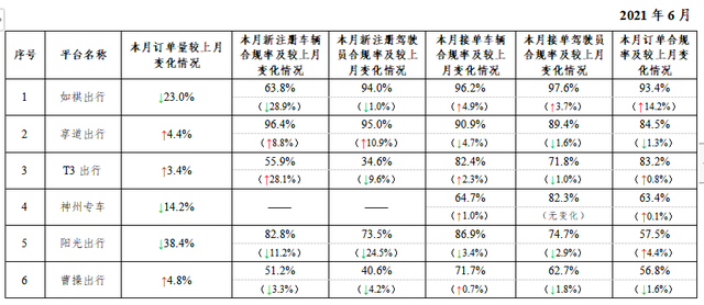 一、在訂單量超過30萬單的網(wǎng)約車平臺中,訂單合規(guī)率最高的是如祺出行,最低的是方舟行。2021年6月訂單量超過30萬單的網(wǎng)約車平臺共13家。與5月份相比,招招出行、東風出行從5月訂單量超過30萬單降到30萬單以下。按訂單合規(guī)率(指駕駛員和車輛均獲得許可的訂單量占比)從高到低的分別是如祺出行、享道出行、T3出行、神州專車、陽光出行、曹操出行、首汽約車、幫邦行、滴滴出行、萬順叫車、美團打車、花小豬出行、方舟行。本月訂單合規(guī)率增長排名前3名的分別是如祺出行、方舟行、花小豬出行;下降最多的分別是曹操出行、享道出行、美團打車。