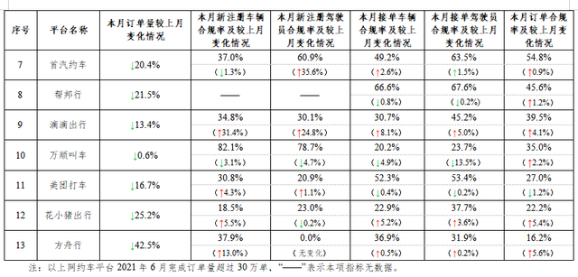 一、在訂單量超過30萬單的網(wǎng)約車平臺(tái)中,訂單合規(guī)率最高的是如祺出行,最低的是方舟行。2021年6月訂單量超過30萬單的網(wǎng)約車平臺(tái)共13家。與5月份相比,招招出行、東風(fēng)出行從5月訂單量超過30萬單降到30萬單以下。按訂單合規(guī)率(指駕駛員和車輛均獲得許可的訂單量占比)從高到低的分別是如祺出行、享道出行、T3出行、神州專車、陽光出行、曹操出行、首汽約車、幫邦行、滴滴出行、萬順叫車、美團(tuán)打車、花小豬出行、方舟行。本月訂單合規(guī)率增長排名前3名的分別是如祺出行、方舟行、花小豬出行;下降最多的分別是曹操出行、享道出行、美團(tuán)打車。