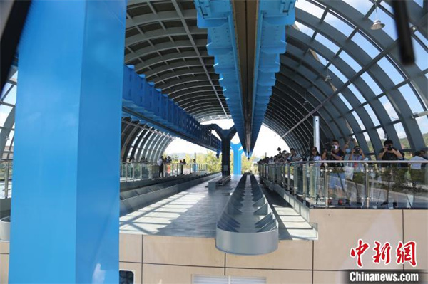 紅白色相間、車頭兩側(cè)印有“興國號(hào)”的磁浮列車等待啟動(dòng)試乘體驗(yàn)。 姜濤 攝