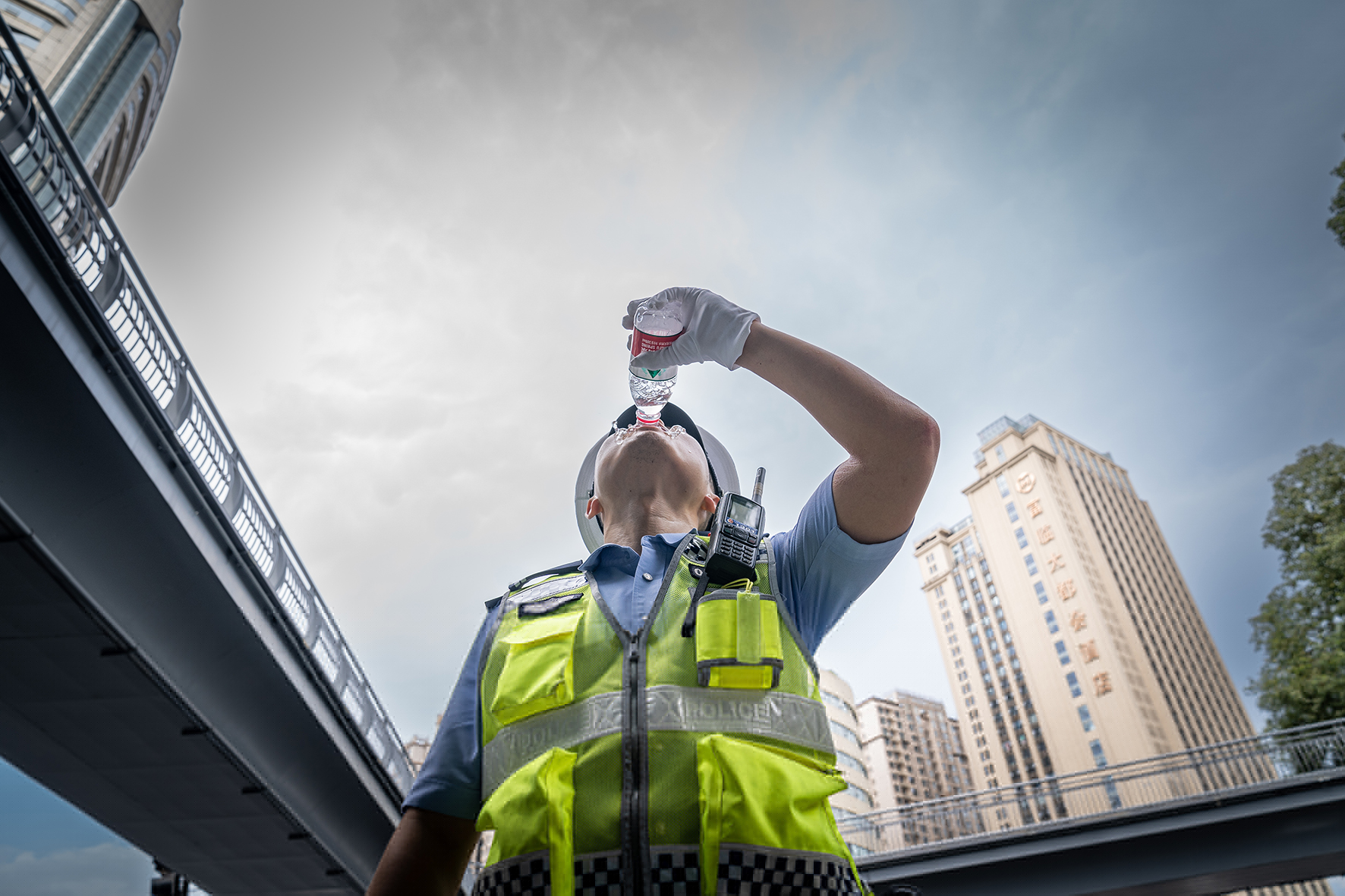 8月8日,四川省綿陽市出現(xiàn)34℃高溫天氣。綿陽市公安局交警直屬一大隊(duì)民警堅(jiān)守路面,冒高溫指揮疏導(dǎo)交通,確保道路安全暢通。