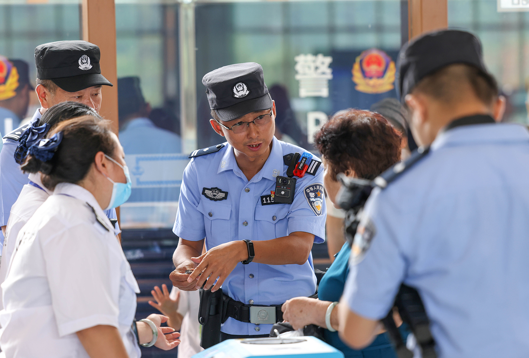 圖為8月8日,鐵路民警在進(jìn)站口檢查危險品。