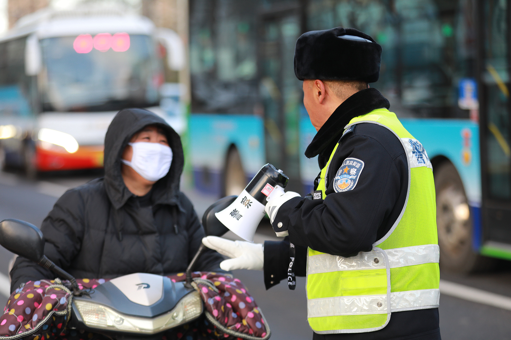 11月16日,遼寧省阜新市公安局交警支隊(duì)海州大隊(duì)民警持“小喇叭”上崗執(zhí)勤,在路口勸導(dǎo)電動自行車駕乘人員佩戴安全頭盔出行。