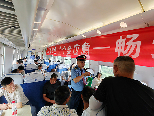 營造濃厚安全氛圍。寧波二隊黨總支在班前學(xué)習(xí)會、列車運行等環(huán)節(jié)開展了形式多樣的“安全生產(chǎn)月”宣傳活動。通過懸掛安全標(biāo)語、播放安全宣傳片等方式,向職工普及鐵路安全知識,提高職工的安全意識和自我保護能力,做到警鐘長鳴。同時,他們還組織職工家屬代表到車隊交流安全生產(chǎn)體會,通報單位安全生產(chǎn)形勢,凝聚共保安全生產(chǎn)營造幸福生活的共識。在列車上開展了旅客安全知識宣講活動,進一步增強了旅客對鐵路安全工作的關(guān)注、理解和支持。