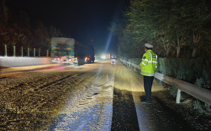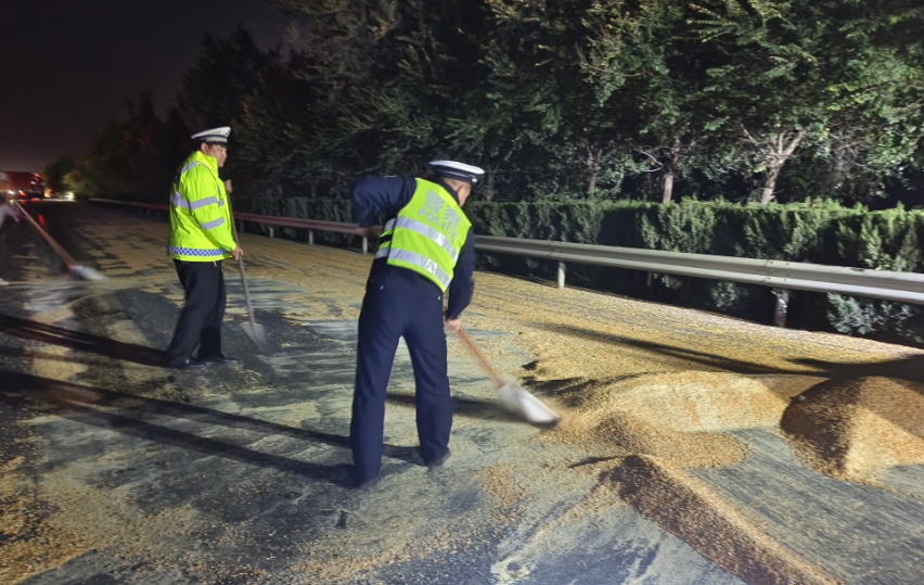 2024年11月4日晚,河南省鶴壁市淇縣交警大隊高村中隊況宏民班組在107國道巡邏時,忽然聽到有人呼喊:“不好!誰的玉米灑了?!?/span>