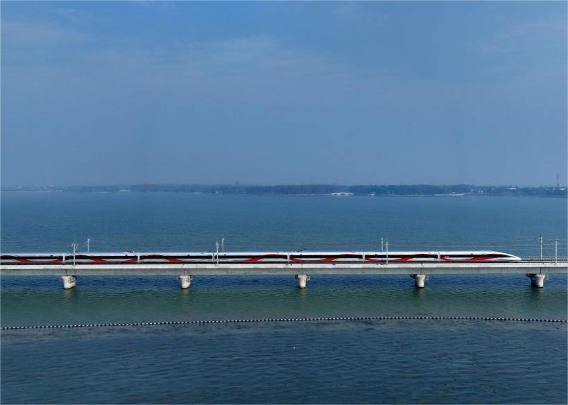 12月26日,列車(chē)駛過(guò)滬蘇湖高鐵元蕩湖段(無(wú)人機(jī)照片)。