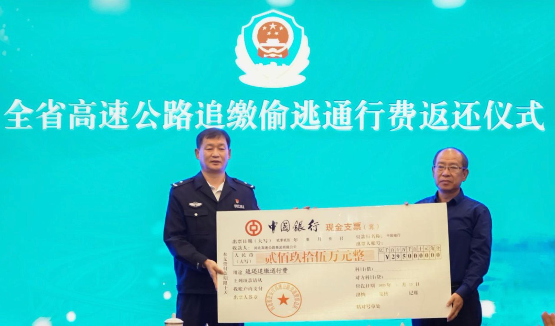 為集中展示高速交警依法刑事打擊涉交類違法犯罪專項(xiàng)行動(dòng)成效,1月3日,河北省高速交警總隊(duì)舉辦全省高速公路追繳偷逃通行費(fèi)返還儀式,向河北高速集團(tuán)、河北交投集團(tuán)、北京首發(fā)集團(tuán)、內(nèi)蒙古交通集團(tuán)、石家莊市高速集團(tuán)5家業(yè)主單位返還追繳偷逃通行費(fèi)550萬(wàn)元。