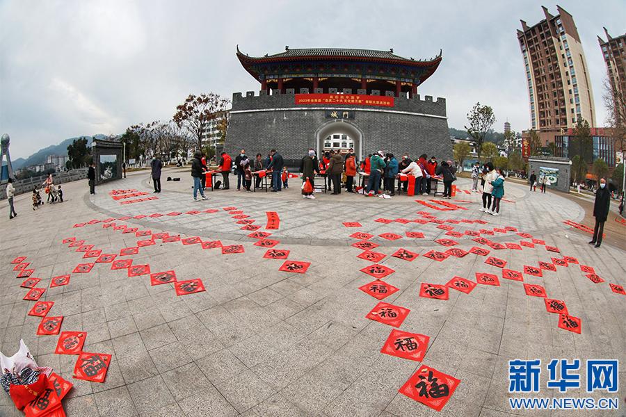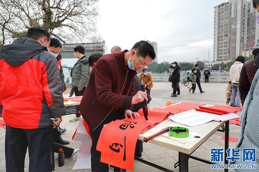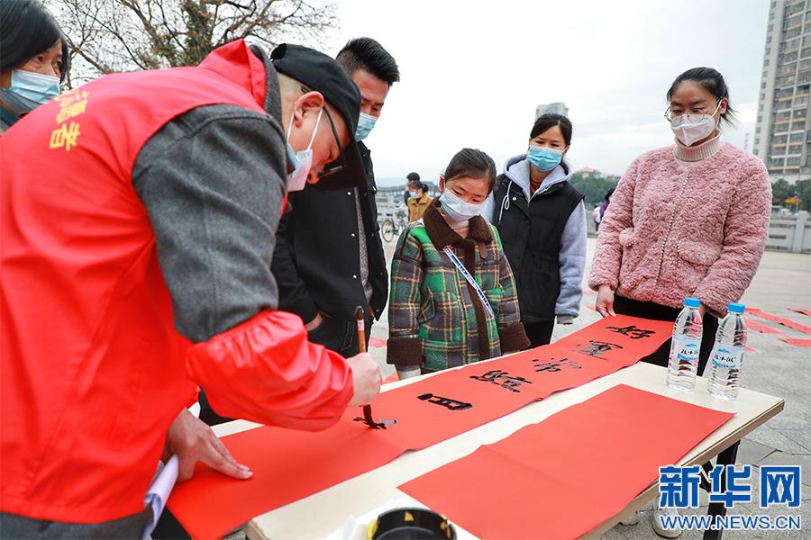 新春佳節(jié)將至,江西省贛州市全南縣組織縣書法家協(xié)會(huì)會(huì)員、書法愛好者分組深入全縣各個(gè)鄉(xiāng)鎮(zhèn)、各城市社區(qū)為群眾現(xiàn)場免費(fèi)書寫春聯(lián),送上新春的美好祝福。(譚茜予 尹其奇)