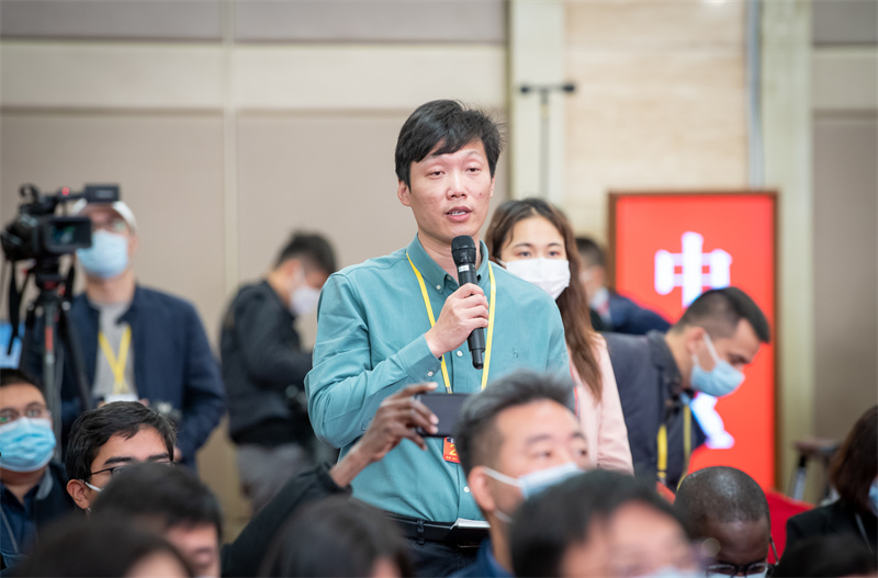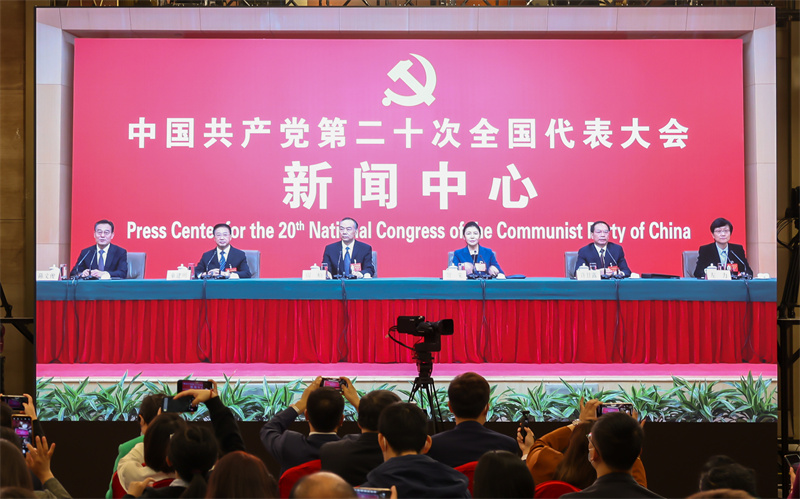 10月19日,黨的二十大新聞中心舉行記者招待會(huì)。圖為本報(bào)記者提問(wèn)。 本報(bào)記者 王建軍 攝