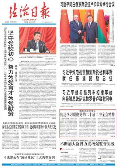 本報(bào)北京3月1日訊 記者張晨 3月1日下午,最高人民法院黨組召開會(huì)議,傳達(dá)學(xué)習(xí)貫徹黨的二十屆二中全會(huì)精神,研究部署貫徹落實(shí)措施。最高人民法院黨組書記、院長周強(qiáng)主持會(huì)議并講話,強(qiáng)調(diào)要深入學(xué)習(xí)貫徹習(xí)近平總書記在黨的二十屆二中全會(huì)上的重要講話精神,把思想和行動(dòng)統(tǒng)一到黨中央決策部署上來,牢記“國之大者”,落實(shí)“三個(gè)更好統(tǒng)籌”,充分發(fā)揮審判職能作用,以高質(zhì)量司法服務(wù)高質(zhì)量發(fā)展。