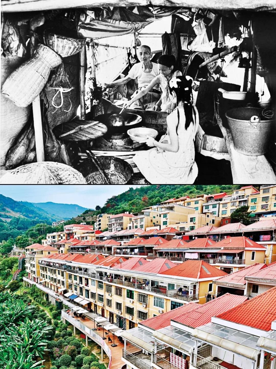 在福建省寧德市福安市下岐村,歷史上,村民祖祖輩輩以在淺海灘涂“討小?!睘樯?,一條小木船就是幾代人的家,生活條件異常艱苦,被稱為“連家船民”。20世紀(jì)90年代,福建“造福工程”啟動(dòng),下岐村采取“分期分批,全面搬遷”的辦法,將2000多名漁民安置上岸。如今的下岐村,成排的小洋樓矗立,漁民廣場(chǎng)、白馬公園等休閑設(shè)施一應(yīng)俱全,呈現(xiàn)出一幅百姓安居樂(lè)業(yè)的現(xiàn)代鄉(xiāng)村圖景。圖為拼版照片:上圖為20世紀(jì)80年代福建寧德地區(qū)的連家船民生活場(chǎng)景(資料照片);下圖為2023年11月15日拍攝的下岐村(新華社記者 姜克紅/攝)。 新華社發(fā)