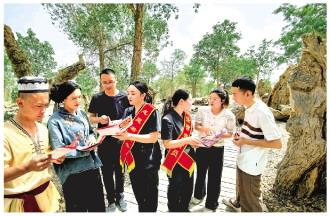 圖為新疆維吾爾自治區(qū)阿瓦提縣人民法院旅游巡回法庭的法官在該縣刀郎部落景區(qū)向游客和景區(qū)服務(wù)商家開展普法宣傳。
