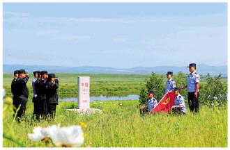 圖為內(nèi)蒙古自治區(qū)呼倫貝爾邊境管理支隊額爾古納邊境管理大隊室韋邊境派出所民警和護邊員在110號界碑旁重溫入黨誓詞。 李永建 攝