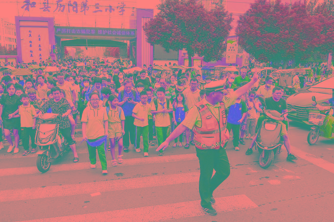 圖①:9月1日,安徽省和縣公安局交警大隊(duì)輔警護(hù)送學(xué)生過馬路。秦祖泉 攝
