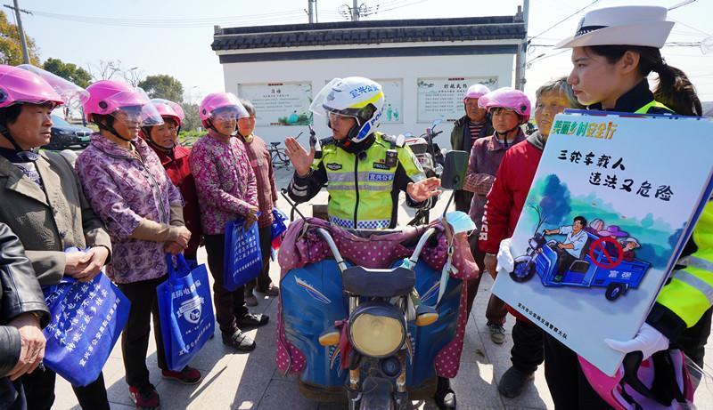 江蘇省宜興市公安局交警大隊近日組織民警深入各鄉(xiāng)鎮(zhèn)開展交通安全宣傳,向群眾講解交通安全知識。