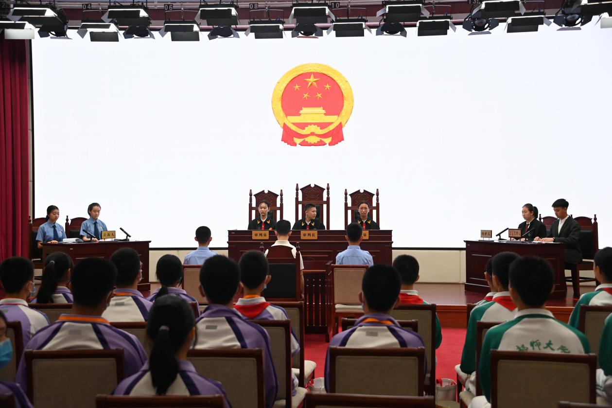 開放日活動的最后一個環(huán)節(jié)是設(shè)立小型模擬法庭,互動式體驗法治教育。在模擬法庭中,首都師范大學(xué)附屬中學(xué)的學(xué)生周詳森和孫鈺桐分別擔(dān)任審判長和公訴人,他們穿上制服,走進法庭,有條不紊、嚴(yán)謹(jǐn)規(guī)范地開啟了“沉浸式”體驗。