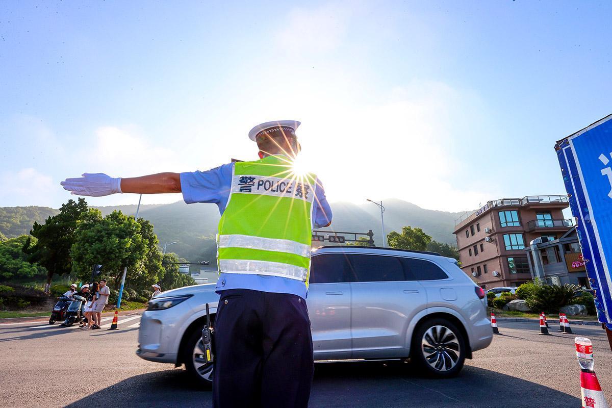 8月3日,浙江省舟山市朱家尖景區(qū)游客紛至沓來,為確保景區(qū)游客平安和道路交通安全有序,舟山市公安局交通警察支隊普陀山交警大隊的民警輔警們,在各景區(qū)和重要路段上巡邏執(zhí)勤,認真做好服務游客和車輛疏堵保暢工作,不懼高溫護平安。
