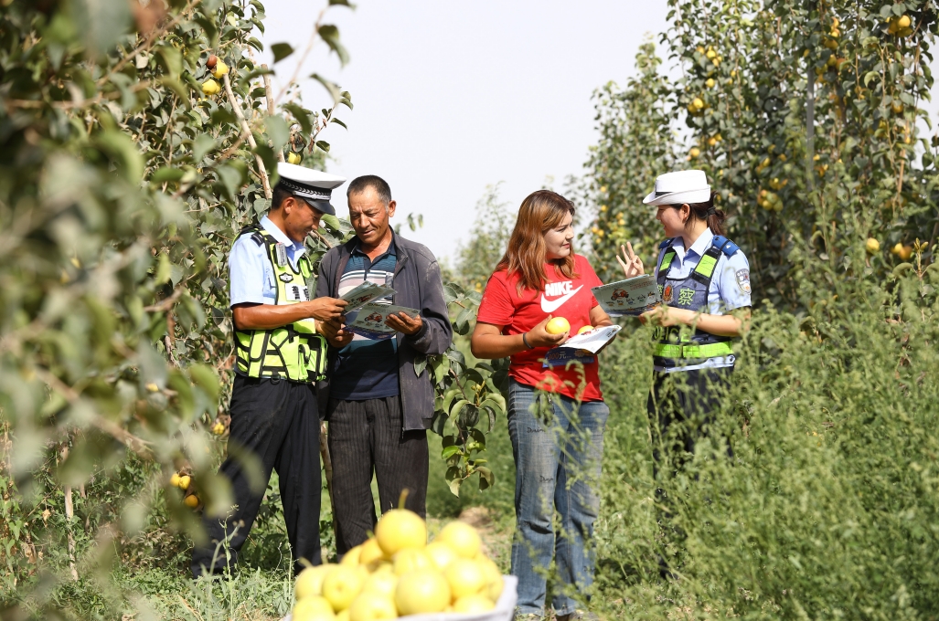 8月12日,新疆喀什地區(qū)葉城縣公安局組織民警深入轄區(qū)梨園,推行“助農(nóng)+普法”工作模式,協(xié)助果農(nóng)采摘果實,并在勞作休息時間,面對面開展普法宣傳,用實際行動守護果農(nóng)的勞動成果。