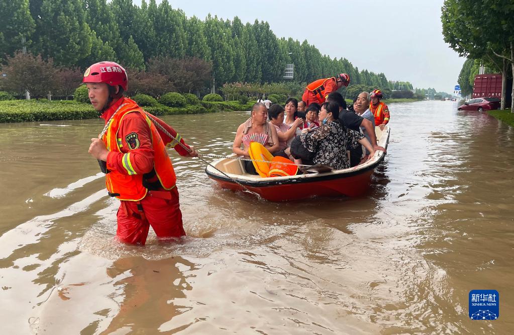 在河南省鄭州市中牟縣,李勝利(左一)在疏散被困群眾(2021年7月19日攝)。新華社發(fā)(田聰 攝)