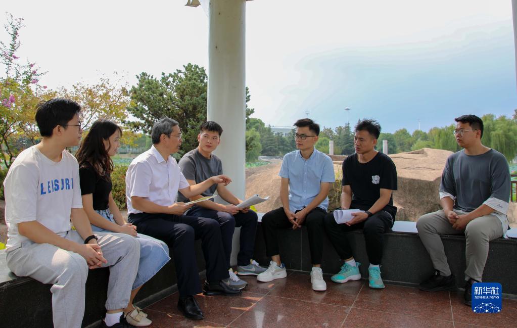 9月12日,安徽師范大學(xué)馬克思主義學(xué)院教授路丙輝(左三)與學(xué)生們?cè)谛@內(nèi)的文思亭交談。新華社記者 曹力 攝