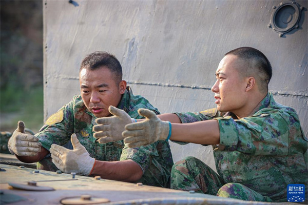 陸軍第71集團(tuán)軍某旅“濟(jì)南英雄連”連長孫金龍(左)向步戰(zhàn)車駕駛員請教專業(yè)知識(2022年9月18日攝)。新華社發(fā)(黃振宇 攝)