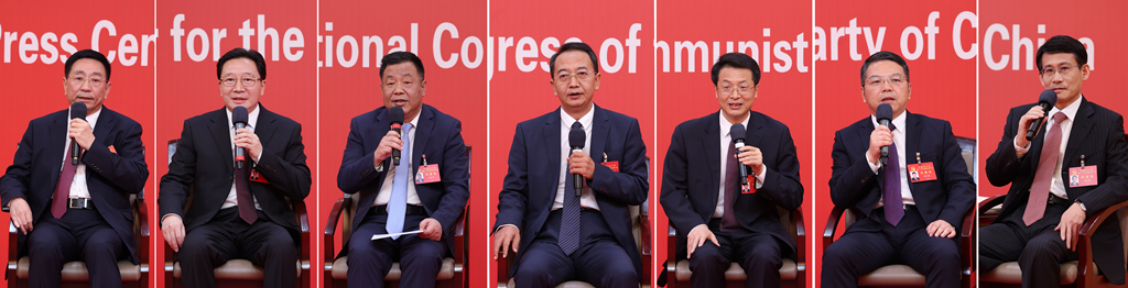 10月19日,中國共產(chǎn)黨第二十次全國代表大會(huì)新聞中心舉行集體采訪。山東、河南、湖北、湖南、廣東、廣西、海南代表團(tuán)新聞發(fā)言人出席,介紹代表團(tuán)學(xué)習(xí)討論二十大報(bào)告情況,并回答記者提問(拼版照片)。