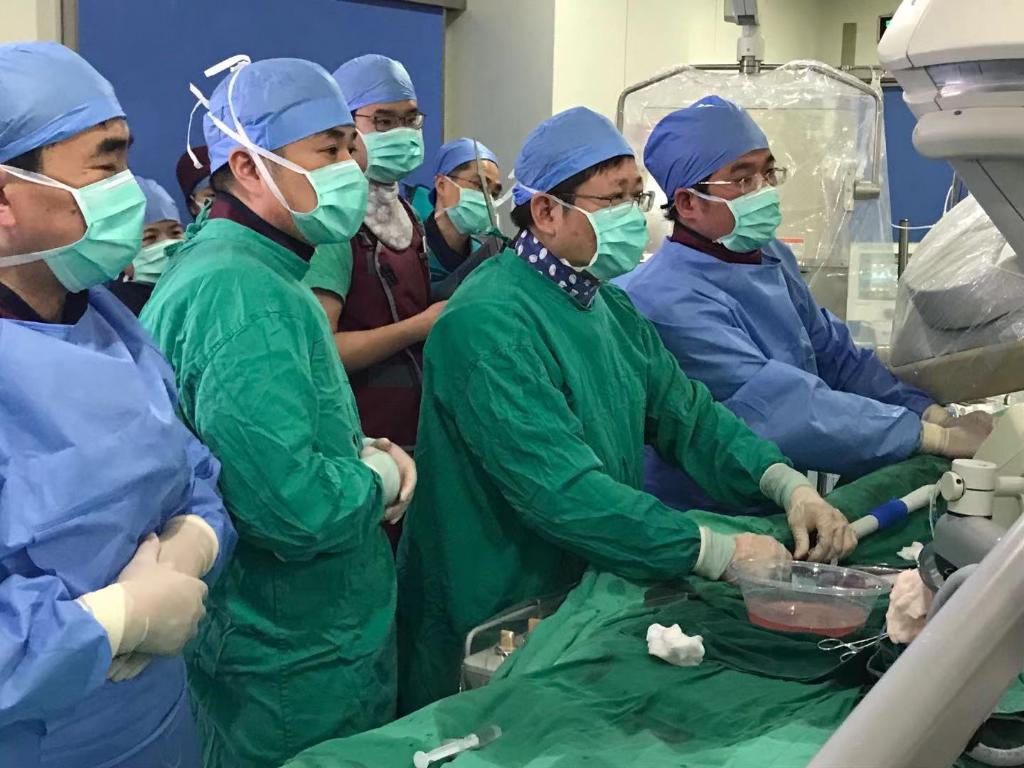 圖為潘文志(右一)及其團(tuán)隊(duì)正在實(shí)施經(jīng)導(dǎo)管瓣膜介入手術(shù)。