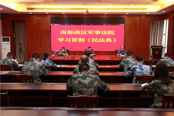 南部戰(zhàn)區(qū)軍事法院召開(kāi)專(zhuān)題黨委會(huì),認(rèn)真學(xué)習(xí)習(xí)近平主席在中央政治局第二十次集體學(xué)習(xí)時(shí)的重要講話、全國(guó)法院學(xué)習(xí)貫徹2020年全國(guó)兩會(huì)精神視頻會(huì)議精神和民法典,專(zhuān)題部署推動(dòng)戰(zhàn)區(qū)兩級(jí)軍事法院和轄區(qū)部隊(duì)民法典學(xué)習(xí)宣傳貫徹工作,要求戰(zhàn)區(qū)兩級(jí)軍事法院在學(xué)習(xí)宣傳貫徹民法典中走在前列,為部隊(duì)和官兵樹(shù)好標(biāo)桿;準(zhǔn)確理解和把握民法典立法精神、條文含義和最新內(nèi)容,提高運(yùn)用民法典維護(hù)官兵權(quán)益、化解矛盾糾紛、促進(jìn)部隊(duì)和社會(huì)和諧穩(wěn)定的能力;把深入宣傳貫徹民法典作為當(dāng)前和今后一個(gè)時(shí)期的工作重點(diǎn),在戰(zhàn)區(qū)部隊(duì)營(yíng)造尊法學(xué)法守法用法的濃厚氛圍。