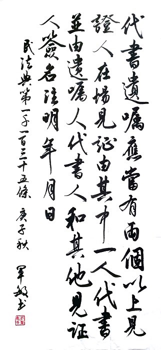 民法典第一千一百三十五條 代書遺囑應(yīng)當(dāng)有兩個(gè)以上見證人在場(chǎng)見證,由其中一人代書,并由遺囑人、代書人和其他見證人簽名,注明年、月、日。