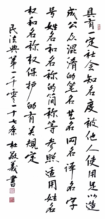 民法典第一千零一十七條 具有一定社會知名度,被他人使用足以造成公眾混淆的筆名、藝名、網(wǎng)名、譯名、字號、姓名和名稱的簡稱等,參照適用姓名權(quán)和名稱權(quán)保護(hù)的有關(guān)規(guī)定。