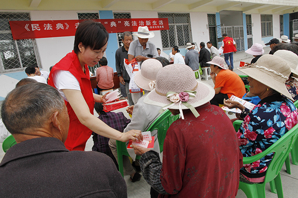 圖為律師和志愿者正在向村民們宣講民法典相關(guān)內(nèi)容。