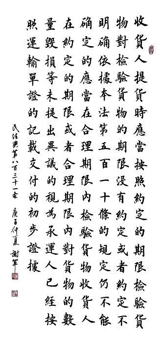 民法典第八百三十一條 收貨人提貨時應(yīng)當按照約定的期限檢驗貨物。對檢驗貨物的期限沒有約定或者約定不明確,依據(jù)本法第五百一十條的規(guī)定仍不能確定的,應(yīng)當在合理期限內(nèi)檢驗貨物。收貨人在約定的期限或者合理期限內(nèi)對貨物的數(shù)量、毀損等未提出異議的,視為承運人已經(jīng)按照運輸單證的記載交付的初步證據(jù)。
