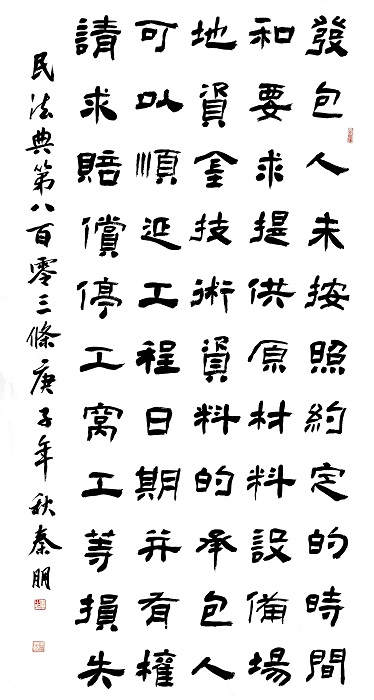 書法作品獲“農(nóng)行杯”首屆中國(guó)電視書法大賽一等獎(jiǎng)等。出版《秦朋隸書<論語(yǔ)>書法作品集》等。