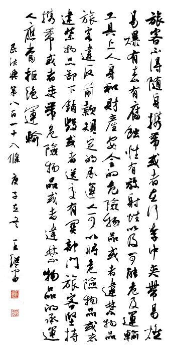 民法典第八百一十八條 旅客不得隨身攜帶或者在行李中夾帶易燃、易爆、有毒、有腐蝕性、有放射性以及可能危及運(yùn)輸工具上人身和財(cái)產(chǎn)安全的危險(xiǎn)物品或者違禁物品。