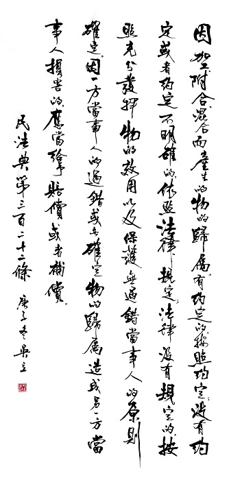 民法典第三百二十二條 因加工、附合、混合而產(chǎn)生的物的歸屬,有約定的,按照約定;沒有約定或者約定不明確的,依照法律規(guī)定;法律沒有規(guī)定的,按照充分發(fā)揮物的效用以及保護無過錯當(dāng)事人的原則確定。因一方當(dāng)事人的過錯或者確定物的歸屬造成另一方當(dāng)事人損害的,應(yīng)當(dāng)給予賠償或者補償。
