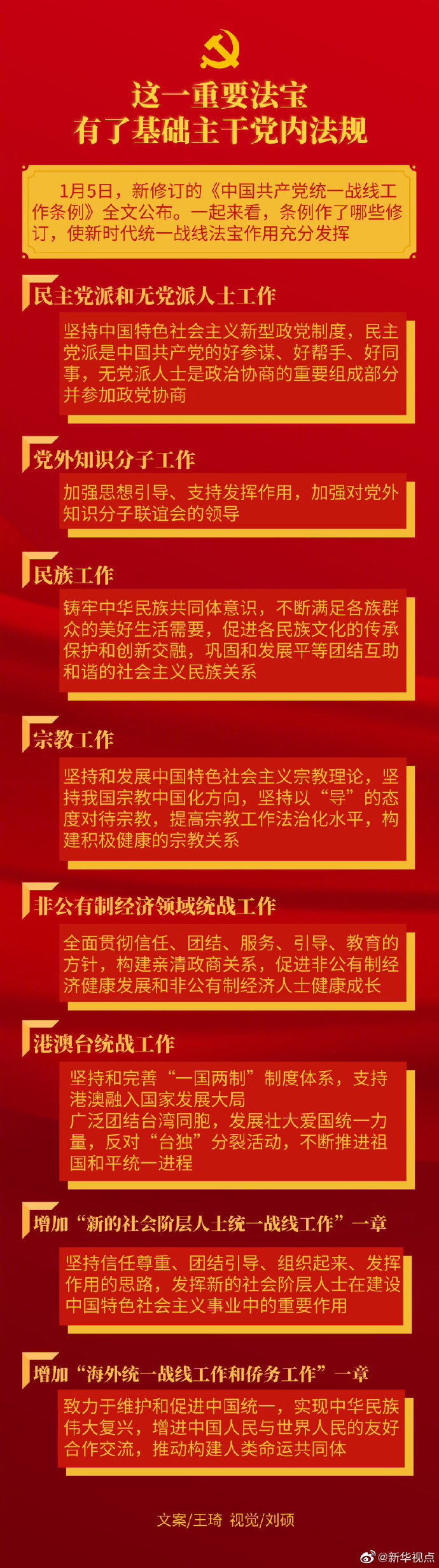 統(tǒng)一戰(zhàn)線是黨的事業(yè)取得勝利的重要法寶。1月5日,新修訂的《中國共產(chǎn)黨統(tǒng)一戰(zhàn)線工作條例》全文公布。條例作了哪些修訂,使新時代統(tǒng)一戰(zhàn)線法寶作用充分發(fā)揮,為全面建設(shè)社會主義現(xiàn)代化國家、實現(xiàn)中華民族偉大復(fù)興的中國夢凝心聚力,一起來看↓